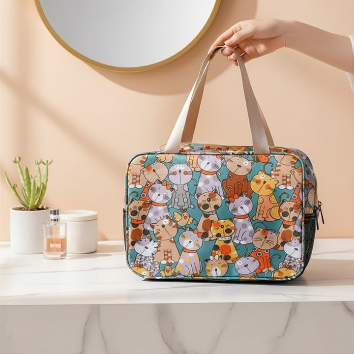 Emporter vos affaires de beauté n'a jamais été aussi amusant. Les imprimés chats ajoutent une note de gaieté tout en reflétant votre amour pour ces compagnons moustachus. Le fond vert frais met en valeur les illustrations et fait de ce vanity un objet que vous serez fier de montrer.